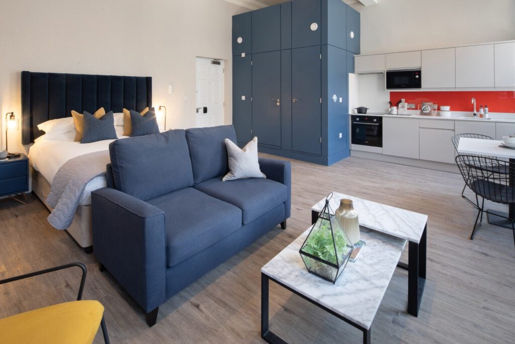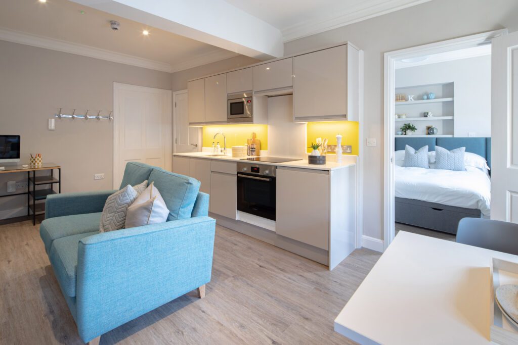 Each Junior Suite has been designed to maximise comfort and style in a beautifully open layout. The studio features a spacious combined living, sleeping, and dining area, creating a seamless flow that feels both modern and inviting. With a plush double bed, dedicated workspace, and a fully equipped kitchen, it’s the perfect base for professionals and leisure guests alike.